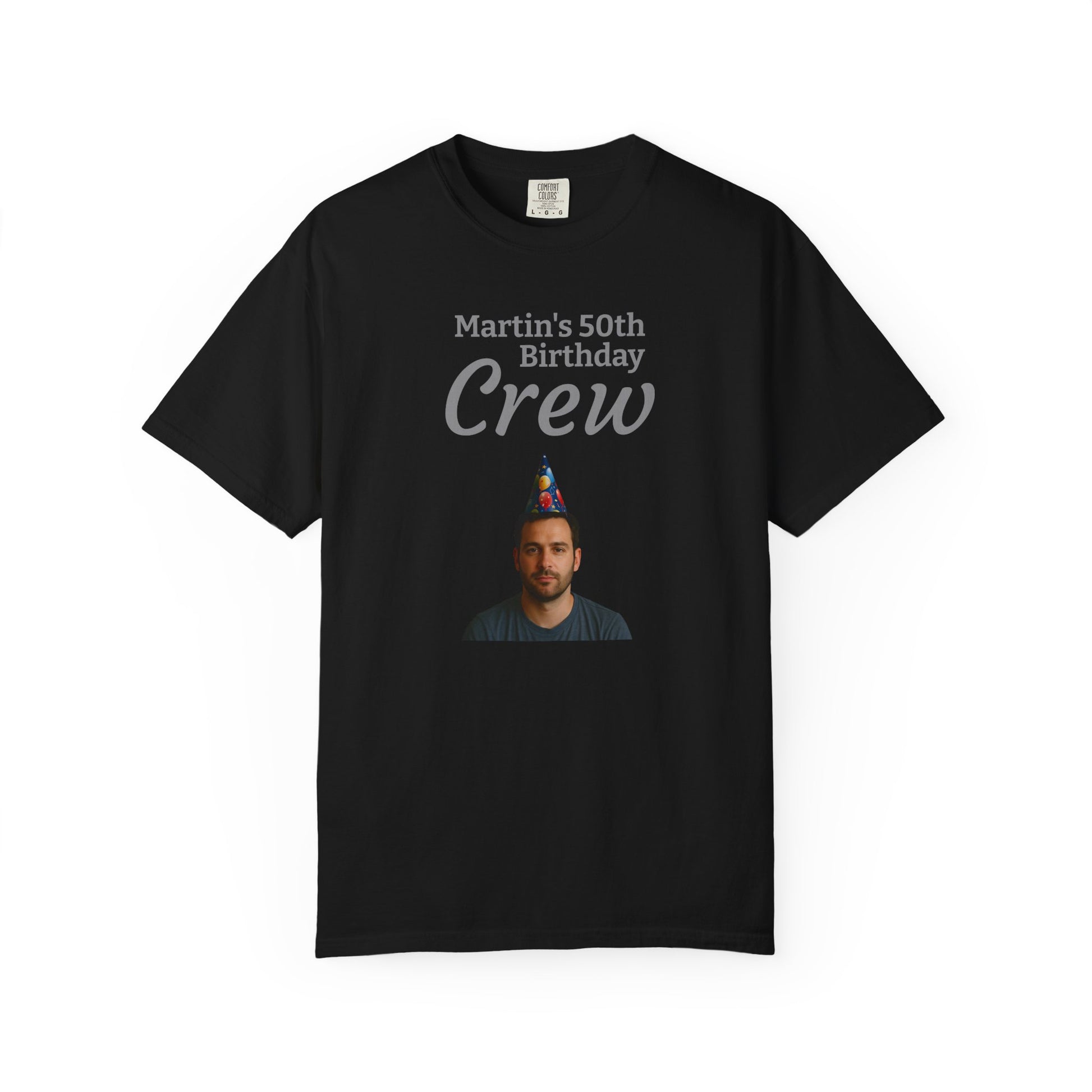 This custom birthday crew t-shirt turns celebration into something personal and worn with pride. Upload a photo and add a name, and we’ll place it into the front template just as you see it, then print it and add any message you want on the back. Soft, garment-dyed cotton gives the tee a lived-in color and comfortable hand; double-needle stitching and tubular knit keep it sturdy and smooth. It sits relaxed and easy on the body, letting the photo and words take center stage at birthday get-togethers, backyard parties, or low-key family dinners. Whether it’s a grown-up’s nostalgia piece or a playful, photo-forward keepsake for friends, this tee carries memory, texture, and intention all at once.